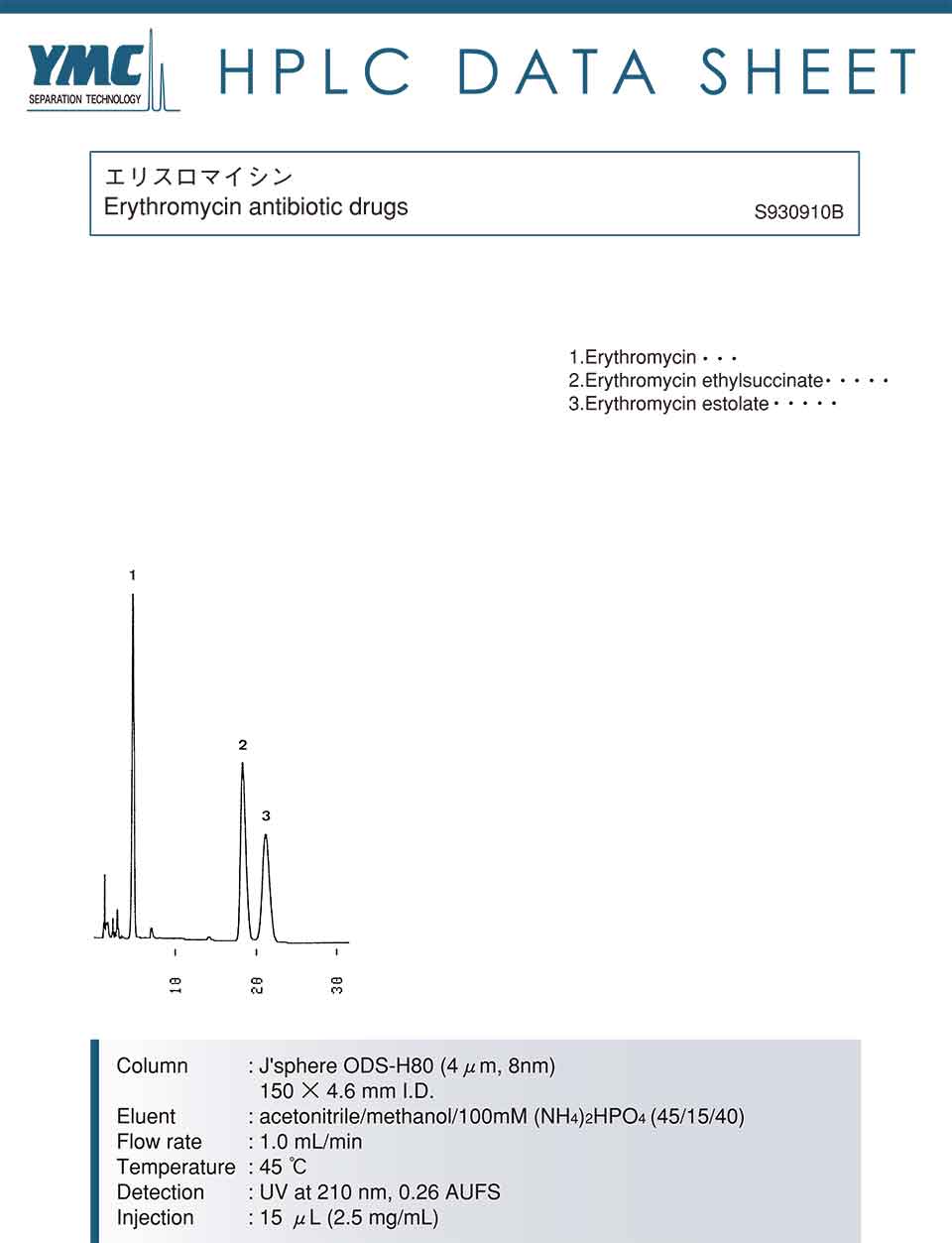 液相色譜法使用J'sphere ODS-H80(JH08S04-1546WT)色譜柱分離測定紅黴素、琥乙紅黴素、依托紅黴素等抗生素。
